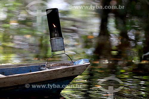 Subject: Detail of poronga - typical lamp used by rubber tappers - prow of motorboat during the collection of latex - Our Lady of Fatima riparian community / Place: Manaus city - Amazonas state (AM) - Brazil