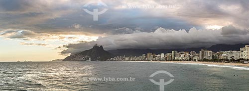 Subject: View of the sunset on a cloudy day - Arpoador Stone with the Ipanema Beach and Morro Dois Irmaos (Two Brothers Mountain) in the background / Place: Ipanema neighborhood - Rio de Janeiro city - Rio de Janeiro state (RJ) - Brazil