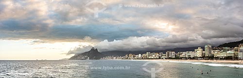 Subject: View of the sunset on a cloudy day - Arpoador Stone with the Ipanema Beach and Morro Dois Irmaos (Two Brothers Mountain) in the background / Place: Ipanema neighborhood - Rio de Janeiro city - Rio de Janeiro state (RJ) - Brazil