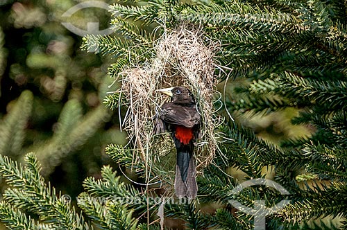 Subject: Detail of red-rumped cacique (Cacicus haemorrhous) perched on the nest / Place: Parana state (PR) - Brazil