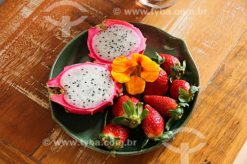 Subject: Detail of the white-fleshed pitahaya (Hylocereus undatus) and strawberry / Place: Espirito Santo state (ES) - Brazil