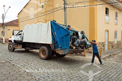 [+] truck, [+] vehicle, [+] automobile, [+] working, [+] work, [+] worker, [+] person, [+] people, [+] dirt, [+] clean, [+] cleaning, [+] public service, [+] refuse collector, [+] man, [+] adult, [+] garbage truck, [+] collecting, [+] curbside collection, [+] garbage collection, [+] trash, [+] garbage, [+] road transport, [+] road transportation, [+] transport, [+] transportation, [+] infrastructure, [+] street, [+] Southeast Region, [+] Paraiba Valley