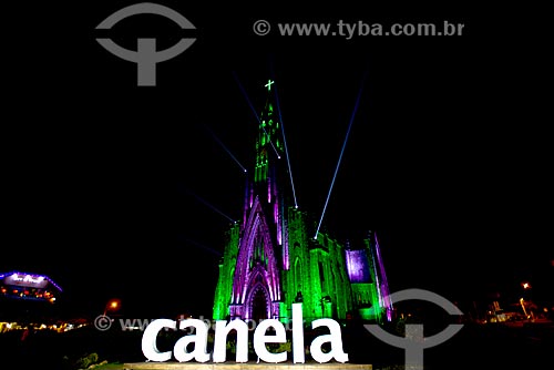 Subject: View of the Nossa Senhora de Lourdes Church - also know as Catedral de Pedra (Cathedral of Stone) - with special lighting during the night / Place: Canela city - Rio Grande do Sul state (RS) - Brazil