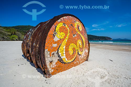 Subject: Detail of the old metal barrel stranded - Lopes Mendes Beach waterfront / Place: Ilha Grande District - Angra dos Reis city - Rio de Janeiro state (RJ) - Brazil