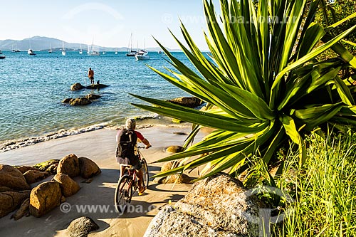 Subject: Fisherman and cyclist - Jurere Beach waterfront / Place: Jurere neighborhood - Florianopolis city - Santa Catarina state (SC) - Brazil