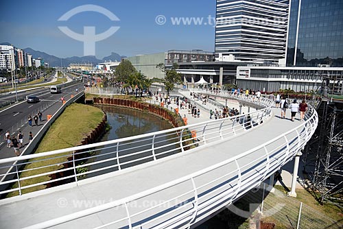 Subject: View of footbridge Station of BRT Transolimpica - Terminal Centro Olimpico Station - to access to Embaixador Abelardo Bueno Avenue with the Rio 2016 Olympic Park in the background / Place: Barra da Tijuca neighborhood - Rio de Janeiro city - Rio de Janeiro state (RJ) - Brazil