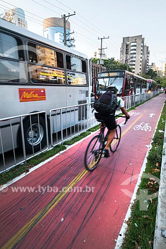 Subject: Cyclist in bike lane beside of the Engineer Luis Carlos Berrini Avenue during the rush hour / Place: Cidade Moncoes neighborhood - Sao Paulo city - Sao Paulo state (SP) - Brazil