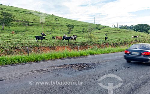 Subject: Bad condition of asphalt of the MG-126 highway between the Guarani and Rio Novo cities with cattle raising in the pasture in the background / Place: Rio Novo city - Minas Gerais state (MG) - Brazil