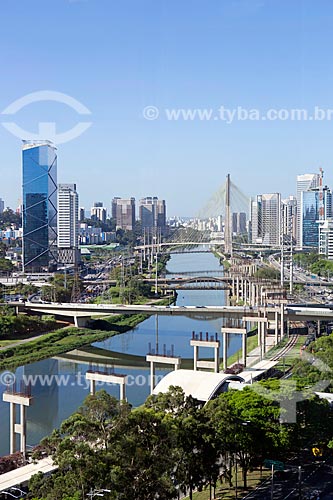 Subject: View of snippet of the Pinheiros River with the Octavio Frias de Oliveira Brigde (2008) in the background / Place: Chacara Santo Antonio neighborhood - Sao Paulo city - Sao Paulo state (SP) - Brazil