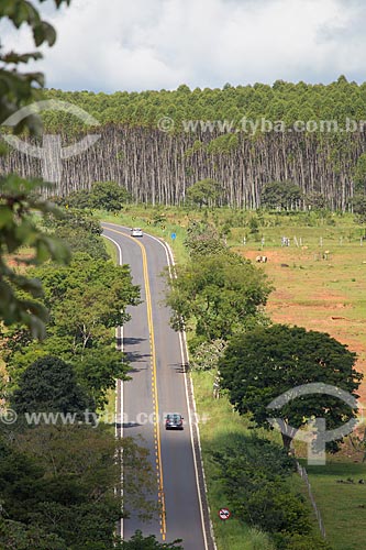 Subject: View of GO-164 Highway - between the Goias city and Mossamedes cities - with the eucalyptus plantation in the background / Place: Goias city - Goias state (GO) - Brazil