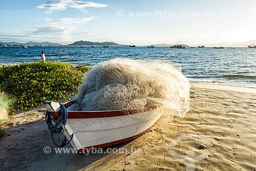Subject: Berthed boat with fishing net - Ponta das Canas Beach waterfront / Place: Ponta das Canas neighborhood - Florianopolis city - Santa Catarina state (SC) - Brazil