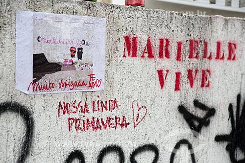 Subject: Detail of poster - tributes to remember 1 month for the murder of Vereadora Marielle Franco - John Paul I Street - where she got shot dead on March 14, 2018 / Place: Estacio neighborhood - Rio de Janeiro city - Rio de Janeiro state (RJ) - Brazil