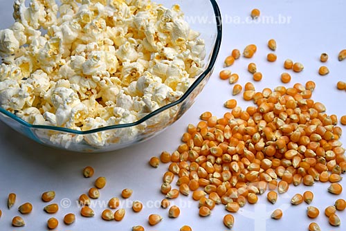 Subject: Detail of popcorn burst and grains of corn for popcorn (Zea mays everta) / Place: Studio - Brazil