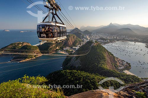 Subject: Cable car of Sugar Loaf making the crossing between the Urca Mountain and Sugar Loaf during sunset / Place: Urca neighborhood - Rio de Janeiro city - Rio de Janeiro state (RJ) - Brazil