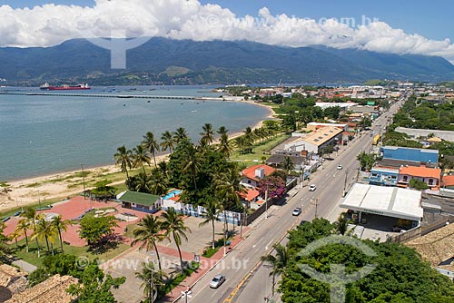 Subject: Picture taken with drone of the urban snippet of Doutor Manuel Hipolito Rego Highway (SP-055) with the Ilhabela in the background / Place: Sao Sebastiao city - Sao Paulo state (SP) - Brazil