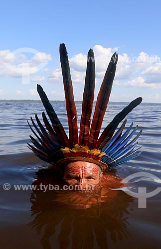 [+] person, [+] ethnicity, [+] people, [+] culture, [+] craftwork, [+] craftsmanship, [+] indigenous, [+] indian, [+] handicraft, [+] handmade, [+] Indigenous craftwork, [+] feather, [+] indigenous art, [+] headdresses, [+] cocar, [+] decoration, [+] decor, [+] adornment, [+] ornament, [+] North Region, [+] amazonian region, [+] Negro River, [+] dark water, [+] black water, [+] sediment, [+] river, [+] landform, [+] nature, [+] indigenous culture, [+] head, [+] face, [+] body, [+] man, [+] adult, [+] Tatuyo