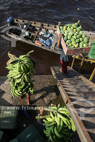 Subject: Man carrying bananas bunch and papaya on the head - Manaus Moderna Port / Place: Manaus city - Amazonas state (AM) - Brazil