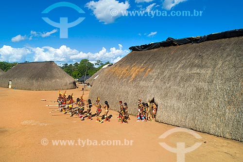 Subject: Picture taken with drone of the Taquara Dance - men in line playing the Urua flute with the women next to - Aiha village of the Kalapalo tribe - INCREASE OF 100% OF THE VALUE OF TABLE / Place: Querencia city - Mato Grosso state (MT) - Brazil