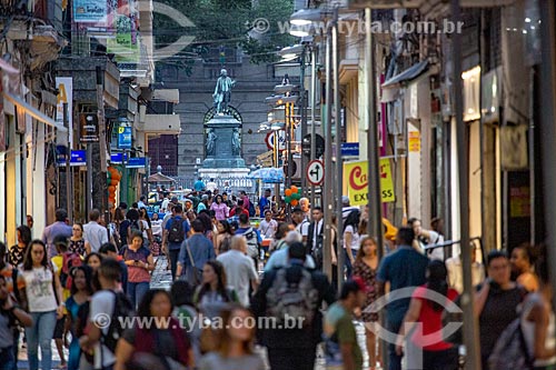 Subject: Pedestrians - Ouvidor Street with the statue in tribute of Jose Bonifacio (1872) - Largo de Sao Francisco de Paula Square - in the background / Place: City center neighborhood - Rio de Janeiro city - Rio de Janeiro state (RJ) - Brazil