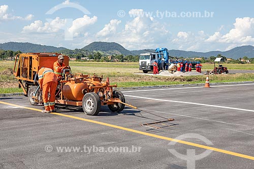 Subject: Labourers of the Municipality of Marica doing the road signaling paint - runway of the Laelio Baptista Airport - also known as Marica Airport / Place: Marica city - Rio de Janeiro state (RJ) - Brazil