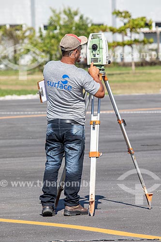 Subject: Topographer with topographic station during work - runway of the Laelio Baptista Airport - also known as Marica Airport / Place: Marica city - Rio de Janeiro state (RJ) - Brazil