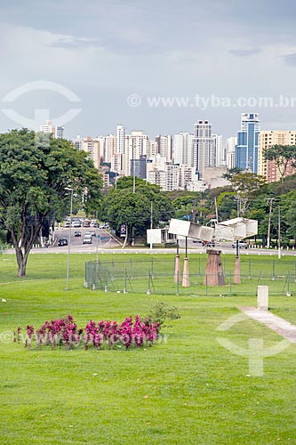Subject: Replica of 14-bis - airplane designed by Alberto Santos Dumont - Bagatelle Field Square with buildings from the Santana neighborhood in the background / Place: Santana neighborhood - Sao Paulo city - Sao Paulo state (SP) - Brazil