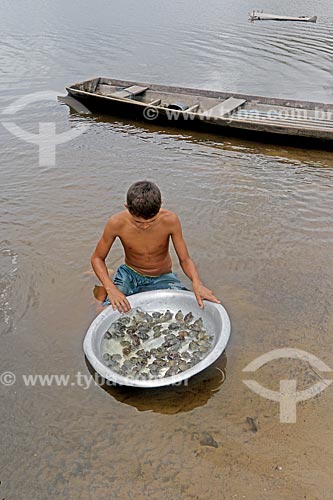 Subject: Riverine boy holding basin with puppies of giant south american river turtle (Podocnemis expansa) on the banks of the Uatuma River / Place: Amazonas state (AM) - Brazil