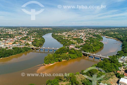 Subject: Picture taken with drone of the bridge BR-070 highway over of Aragarcas city - to the left - Pontal do Araguaia city and Barra do Garcas city - to the right - natural boundary between Mato Grosso and Goias states / Place: Barra do Garcas city - Mato Grosso state (MT) - Brazil