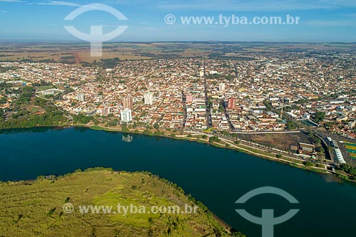 Subject: Picture taken with drone of the Itumbiara city with the Paranaiba River - natural boundary between Goias and Minas Gerais states / Place: Itumbiara city - Goias state (GO) - Brazil