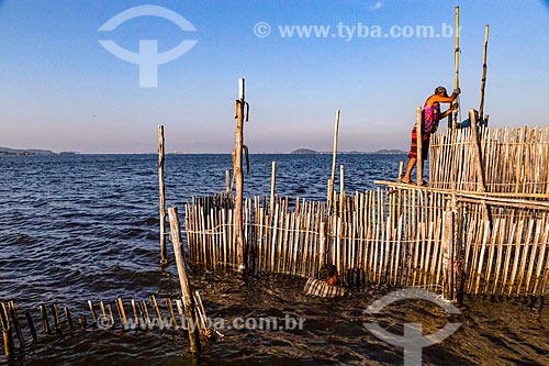 [+] extraction, [+] nature, [+] fishing corral, [+] landform, [+] natural resource, [+] twilight, [+] sunrise, [+] dawn, [+] person, [+] people, [+] working, [+] worker, [+] work, [+] trap, [+] sea, [+] exploration, [+] bay, [+] Guanabara Bay, [+] fisherman, [+] fishery, [+] economy, [+] fishing, [+] Baixada Fluminense, [+] Fluminense Flats, [+] Southeast Region
