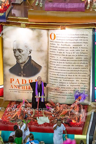 Subject: Parade of Gremio Recreativo Escola de Samba Estacao Primeira de Mangueira Samba School - Float The story that the story does not tell - reveler representing Father Anchieta with dolls representing Indians gagged and murdered / Place: Rio de Janeiro city - Rio de Janeiro state (RJ) - Brazil