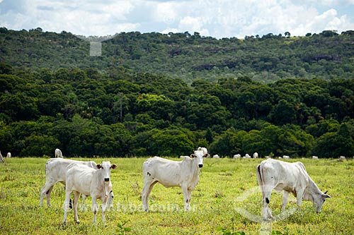 Subject: Cattle raising in the pasture - cerrado with the Caiapo Mountain Range in the background / Place: Piranhas city - Goias state (GO) - Brazil