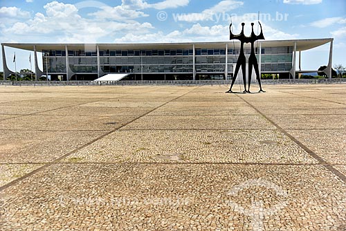 Subject: Sculpture Os Guerreiros (The Warriors) - also known as Os Candangos - with the Palacio do Planalto (Planalto Palace) - headquarters of government of Brazil - in the background / Place: Brasilia city - Distrito Federal (Federal District) (DF) - Brazil