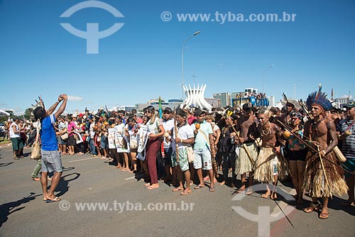 [+] material heritage, [+] world heritage, [+] historic heritage, [+] culture, [+] indigenous culture, [+] indigenous, [+] manifestation, [+] politics, [+] special events, [+] social movement, [+] protest, [+] demonstration, [+] people, [+] person, [+] crowd, [+] protester, [+] demonstrator, [+] indian, [+] monumental axis, [+] Pilot Plan, [+] Midwest Region, [+] Federal District, [+] ethnicity, [+] Brasilia