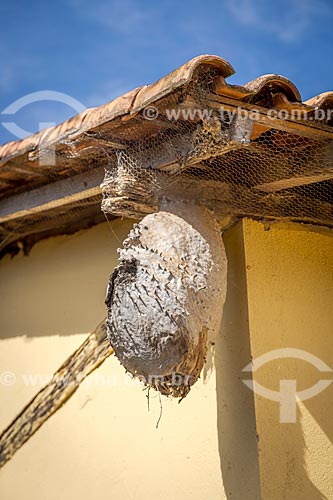 [+] rural zone, [+] zona da mata, [+] forest area, [+] Minas Gerais, [+] Southeast Region, [+] wasp, [+] insect, [+] invertebrate, [+] marimbondo beehive, [+] wasp house, [+] animal, [+] wildlife, [+] wild animal, [+] fauna, [+] nest, [+] house, [+] home, [+] dwelling, [+] housing, [+] habitation, [+] residence, [+] civil construction, [+] tile, [+] roof