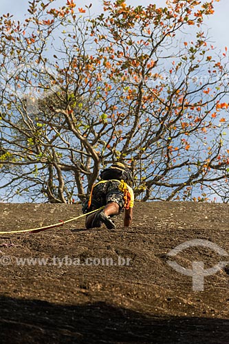 Subject: Detail of climber during the climbing of the north face to Urca Mountain / Place: Urca neighborhood - Rio de Janeiro city - Rio de Janeiro state (RJ) - Brazil