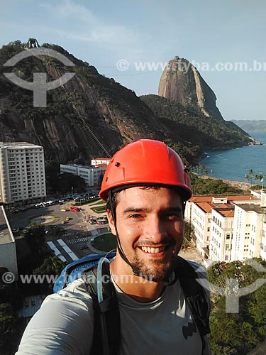 Subject: Climber making a selfie during the climbing to Urca Mountain with the Sugarloaf in the background / Place: Urca neighborhood - Rio de Janeiro city - Rio de Janeiro state (RJ) - Brazil