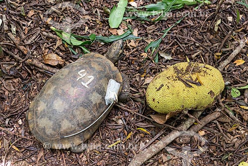 Subject: Yellow-footed turtle with GPS tracker in a biology project in Tijuca Forest / Place: Rio de Janeiro city - Rio de Janeiro state (RJ) - Brazil