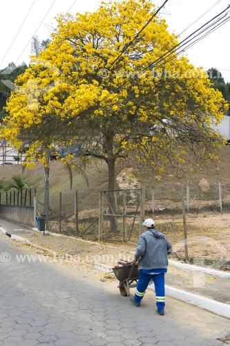 [+] pushcart, [+] flower, [+] flowery, [+] flowering, [+] tree, [+] vegetation, [+] green area, [+] ipe tree, [+] Southeast Region, [+] clean, [+] cleaning, [+] public service, [+] people, [+] person, [+] work, [+] worker, [+] working, [+] uniform, [+] labourer, [+] dirt, [+] garbage, [+] street sweeper, [+] Espirito Santo
