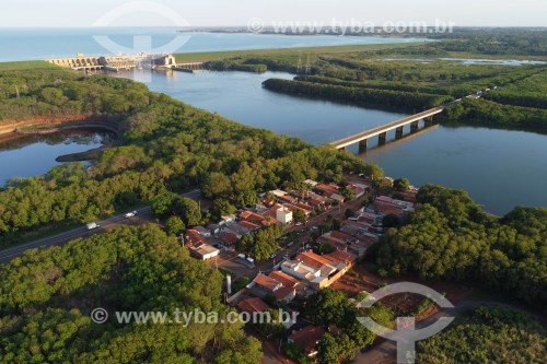 Subject: Picture taken with drone of the Bridge over the Tiete River on the BR-153 (Tranbrasiliana) highway, between the municipalities of Ubarana on the left and Promissao on the right - Promissao Hydroelectric Power Plant in the background / Place: Ubarana city - Sao Paulo state (SP) - Brazil