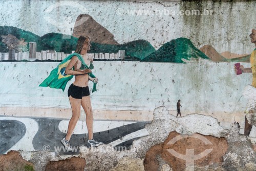 Subject: Wall painting depicting people on the Copacabana boardwalk with the Brazilian flag and the Sugar Loaf Mountain in the background / Place: Copacabana neighborhood - Rio de Janeiro city - Rio de Janeiro state (RJ) - Brazil