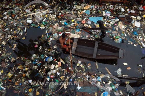 Subject: Canoe navigating in Igarape do Educandos with a lot of garbage during the flood of the rivers / Place: Educandos neighborhood - Manaus city - Amazonas state (AM) - Brazil
