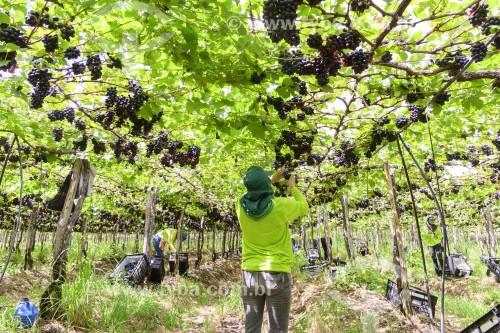 Subject: Workers harvesting bunches of table grapes on a vine of the Vitoria variety / Place: Petrolina city - Pernambuco state (PE) - Brazil