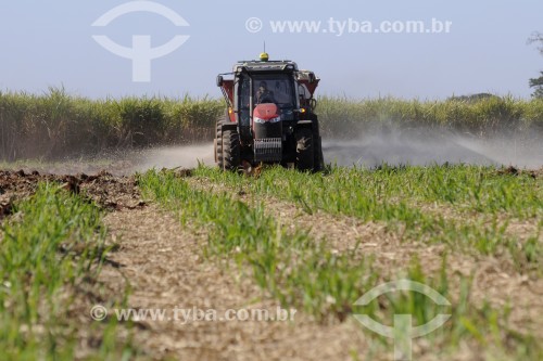 Subject: Tractor making fertilizing soil for planting sugarcane / Place: Pereira Barreto city - Sao Paulo state (SP) - Brazil