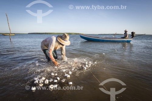 [+] Northeast Region, [+] extraction, [+] exploration, [+] economy, [+] nature, [+] natural resource, [+] green area, [+] people, [+] person, [+] fishing, [+] vegetation, [+] fishery, [+] work, [+] fisherman, [+] river, [+] vessel, [+] canoe, [+] boat, [+] Maranhao, [+] Delta of Parnaiba, [+] fishing net