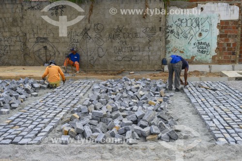 Subject: Workers paving with paving stones at the redevelopment work on the Maranguapinho River / Place: Granja Portugal neighborhood - Fortaleza city - Ceara state (CE) - Brazil