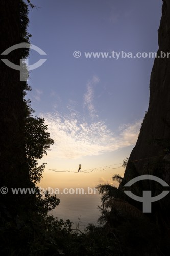 • Practitioner of slackline on the top of the Two Brothers Mountain with ocean in the background - Rio de Janeiro city - Rio de Janeiro state (RJ) - Brazil