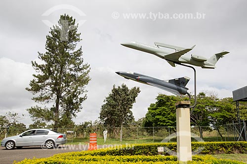 Miniatures of surveillance aircraft R-99A and fighter aircraft F-5 - entrance of Anapolis Air Force Base (BAAN) - Anapolis city - Goias state (GO) - Brazil