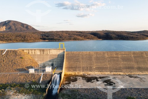 Picture taken with drone of the discharge pipe next to the spillway of the Porcos reservoir - water used to perpetuate streams in the community - Project of Integration of Sao Francisco River with the watersheds of Northeast setentrional - Brejo Santo city - Ceara state (CE) - Brazil