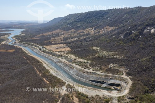 Picture taken with drone of the channel of the north axis of the Transposition of the Sao Francisco River - Reservoir of Morros in the background - Project of Integration of Sao Francisco River with the watersheds of Northeast setentrional - Sao Jose de Piranhas city - Paraiba state (PB) - Brazil